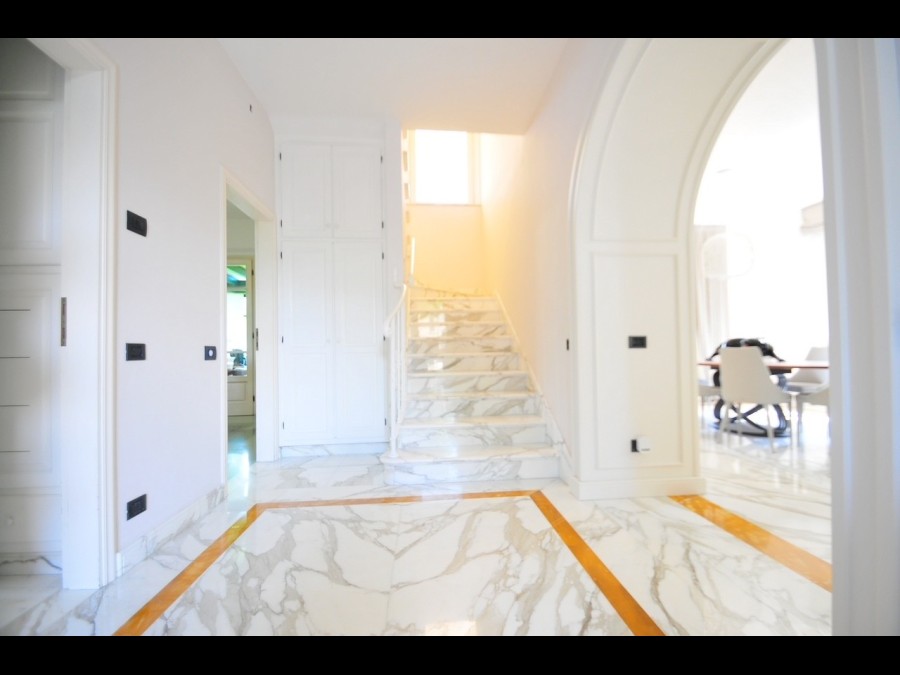 I due livelli sono collegati da una scenografica scala in marmo Calacatta, elemento di grande pregio che conferisce ulteriore eleganza agli interni. La proprietà dispone inoltre di più posti auto interni e offre interessanti potenzialità di ampliamento, con la possibilità di realizzare una dependance, una palestra o un’area benessere, rendendo la villa facilmente personalizzabile secondo le proprie esigenze.