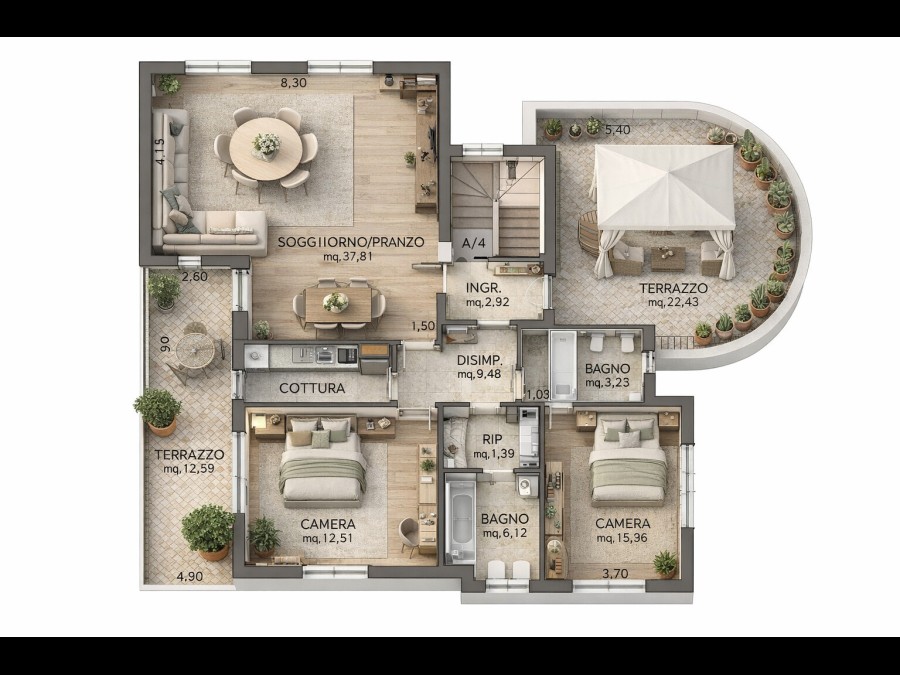 Entrando, si viene subito accolti da un soggiorno-pranzo straordinariamente arioso, cuore conviviale della casa, affiancato da un cucinotto separato e funzionale. La zona notte è pensata per offrire il massimo del relax e della privacy, con due ampie camere matrimoniali e due bagni finestrati, rifiniti con materiali di pregio. Ogni ambiente gode di scorci panoramici che rendono l'atmosfera piacevole in ogni stagione dell'anno.